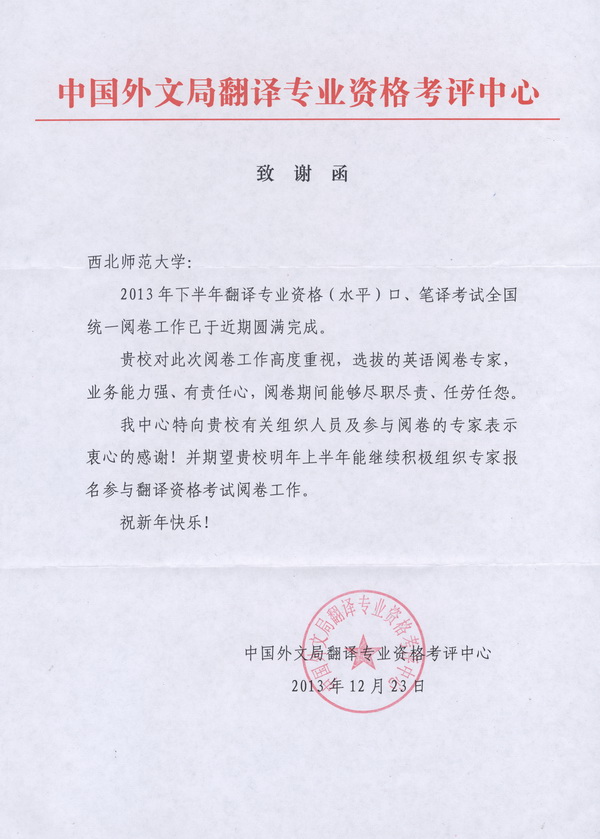 近日,中国外文局翻译专业资格考试中心向公司再次发来致谢函,对公司积极协调组织、协助完成2013年下半年翻译专业资格(水平)考试笔译口译阅卷工作表示感谢,并对参与阅卷工作的教师表示感谢,同时期望公司今后能够继续参与翻译资格考试的阅卷工作。