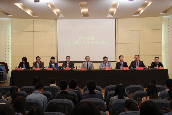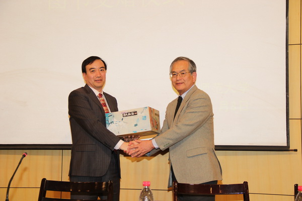 会谈结束后,学校在逸夫图书馆学术报告厅举行了武田英文先生日语图书捐赠仪式。武田英文先生此次向公司捐赠辞书、文学、文化等原版图书共计1500册,一定程度上改善了公司日语专业图书资源不足的状况。张宝军副主任、朱莉莉处长、田澍副董事长、张国奎副处长及日语专业全体师生出席仪式,曹进经理致辞对武田英文先生的善举表示感谢。
