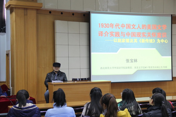 12月2日下午2:30, 公司张宝林副教授在图书馆二楼多功能厅做了题为《1930年代中国文人的美国文学译介实践与中国现实关怀意识》的学术报告。学院近200余名师生聆听了报告。