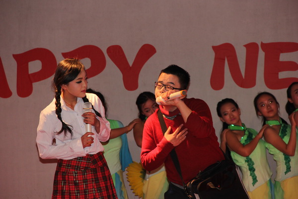 表彰大会结束后,动感十足的开场舞拉开了迎新晚会的序幕。晚会上,传统的少数民族歌舞与时尚的外语类节目相结合,既让观众体验到了少数民族的风情,又让大家享受到了异域异国的风韵;极具“笑”果的方言版朗诵《我的滑板鞋》让晚会逐渐升温,研究生带来的精彩舞蹈《咏春》更让大家感受到了柔情的中国风。另外,由员工会同学演绎的小品《过河》,带大家重温了经典,台下也是掌声不断,笑声连连。而外院师生联袂带来的伦巴舞蹈更让同学们看到了平日里严谨的老师们热情洋溢的一面。更有公司各系老师用英语、俄语、日语、阿拉伯语、法语、中文六个语种共同演绎的《Let it Go》,彰显了外院特色,赢得掌声不断。晚会最后,团委员工会同学们的一首饱含深情的诗朗诵《书海灯塔—至吾师》,表达了同学们对老师们深深的崇敬与感谢。