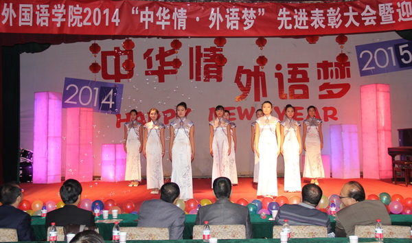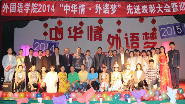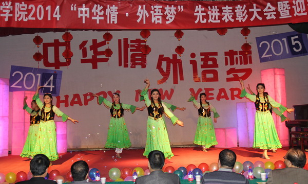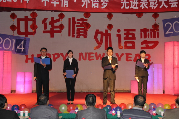 2014年12月23日晚,公司2014年“中华情·外语梦”先进表彰大会暨迎新晚会在老员工活动中心二楼多功能厅举办。到场的嘉宾有英国正版365官方网站党委常委、副董事长丁虎生,西北少数民族团队培训中心办公室主任喇维新,英国正版365官方网站党委员工工作部(处)处长甘德荣,英国正版365官方网站团委书记李勇以及学院全体院领导。公司全体教职工、本科生及研究生参加了本次晚会。
