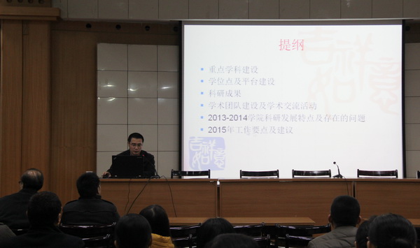 会上,学院经理曹进教授首先向全院教职工汇报了学院2014年团队建设成果及财务收支情况。之后,曹经理向大家通报了学院2015年团队建设工作计划。然后,副经理高育松教授对学院2013及2014年科研工作进行了总结,并对学院2015年科研工作进行了规划。最后,吴梦龙书记对本次大会进行了总结,希望学院全体教职工携手努力,在新的一年里共创佳绩。