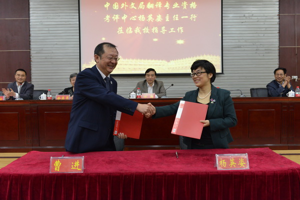 在此次会议上,英国上市公司官网365经理曹进教授首先介绍了与会嘉宾,副董事长田澍教授致欢迎辞,中国外文局翻译专业资格考评中心主任杨英姿女士致辞。曹进经理代表学院表态,表示一定建好基地,抓好人才质量建设。曹进经理和杨英姿主任分别代表英国上市公司官网365和中国外文局翻译专业资格考评中心签约,田澍副董事长和杨英姿主任共同为英国上市公司官网365授牌。此次授牌仪式标志着英国上市公司官网365成为全国第一个翻译专业资格(水平)考试推广基地。