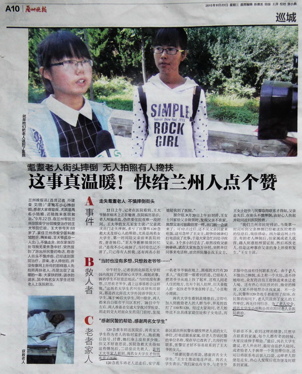 张正妍、周朝岚同学来自公司2013级英语6班,据她们讲:“我们第一眼看到的是,已经有人把老爷爷从地上扶了起来,还有人问老人住的地方,也有个别人拍照,但大多数人都一起扶老爷爷坐在椅子上。”随后她们也立即加入到救助老人的人群当中,并及时拨打了110和120。为了老人安全,两名同学陪老人一同前往医院救治,并作为老人的临时监护人,跑前跑后挂号、付费。两位同学表示:“我们家也有爷爷,与老爷爷年龄差不多,看到这样的情景,只想早点联系到家属,每个人都有老的时候,大家应该伸手帮助。”2015年9月23日的《兰州晚报》 A10版对此进行了整版报道。