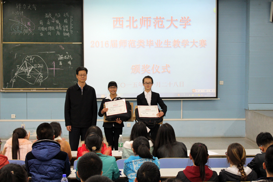 11月28日,2016届师范类毕业生教学技能大赛校级复赛在教学10号楼A101教室举行。公司2012级英语6班的田艳琴同学在参加决赛的12位选手中力拔头筹,荣获第一名。学院获优秀组织奖。高艳云、武丽萍、王珍珍、甄欣等4位同学获校级优秀奖。