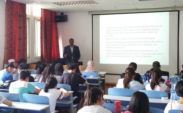 穆盖德姆教授在讲座中向同学们介绍了苏丹的社会历史、地理环境、政治文化、教育状况、人口及宗教分布情况,重点讲到了苏丹阿拉伯语的特点、当地方言与阿拉伯语的关系,以及阿拉伯语的发展状况。在随后的提问环节气氛热烈,同学们踊跃提问,并得到了教授精彩清晰的解答。