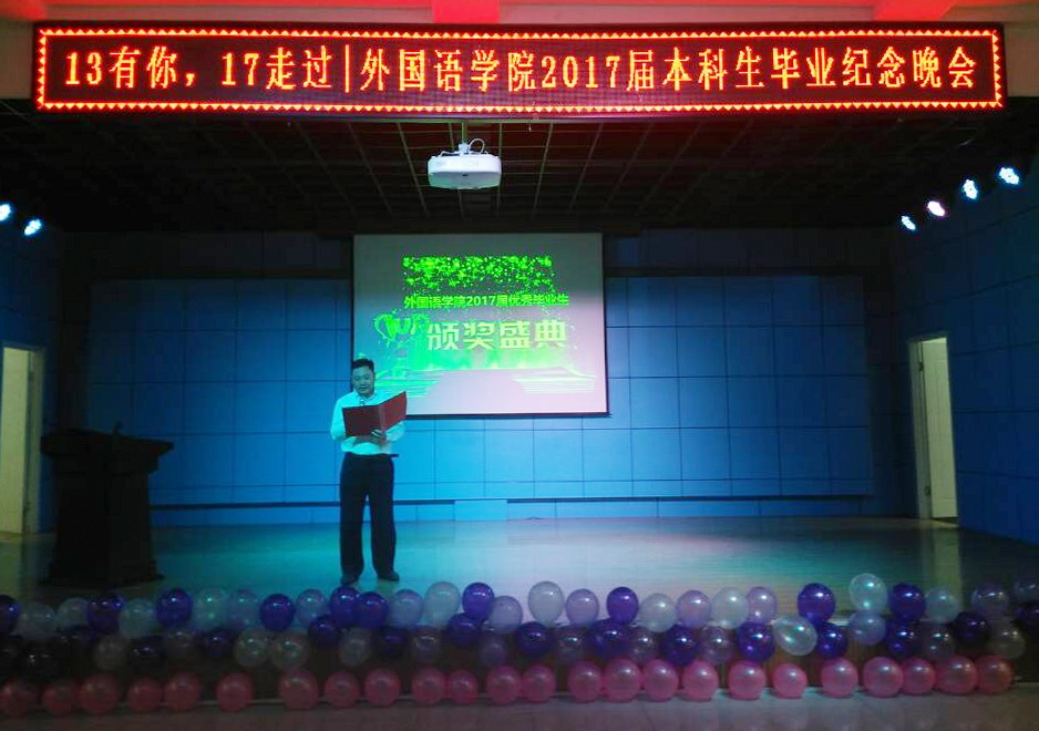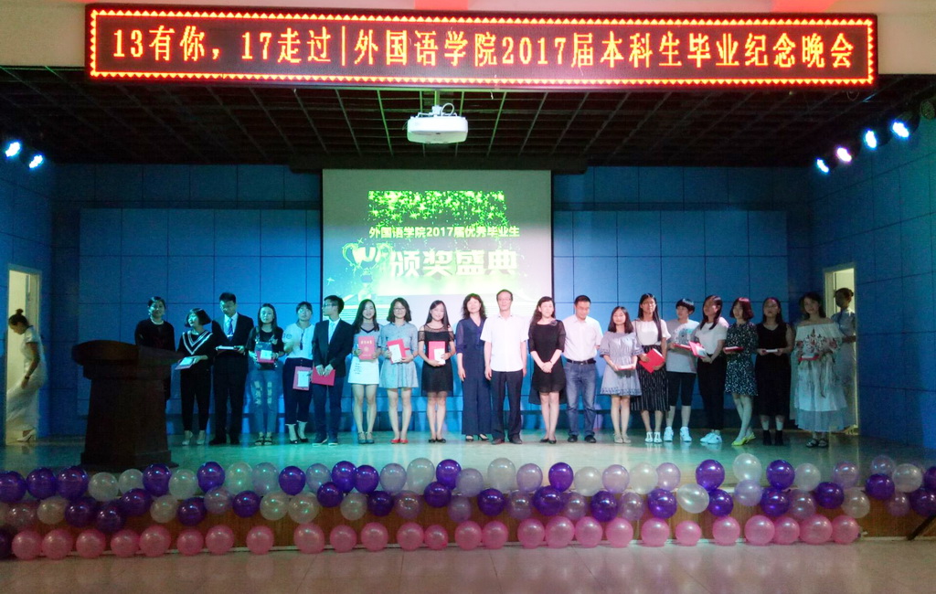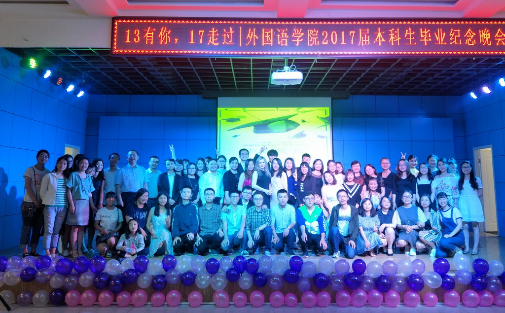 2017年6月6日晚,一场主题为“13有你,17走过”的毕业晚会在公司员工发展中心四楼多功能厅举办。学院领导、各系系主任、毕业班班主任及2017届毕业生300余人参加了本场晚会。晚会由2013级英语5班毕业生王亚妮和鲁天阳同学主持。