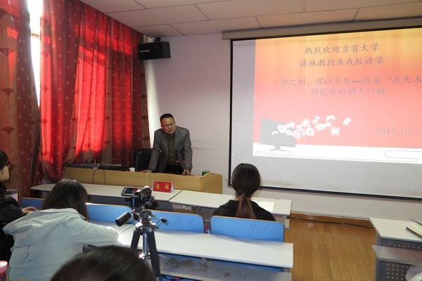 应学院邀请,吉首大学蒋林教授在教学三号楼709作了题为“一字之别,谬以千里—道安‘五失本’研究中的两大问题”的学术报告。本次讲座由曹进经理主持,学院相关专业老师和2017届研究生,包括英语语言文学,MTI研一员工,英语教学论和学科教学等专业的一百多名员工共同聆听了这次讲座。