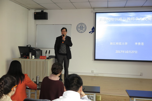 2017年10月27日,应学院邀请,浙江师范大学李贵苍教授在教学3号楼806做了学术讲座,讲座题目为:“后现代知识观与教师个人发展”。本次讲座由曹进经理主持,学院200多名师生共同聆听了此次报告。
