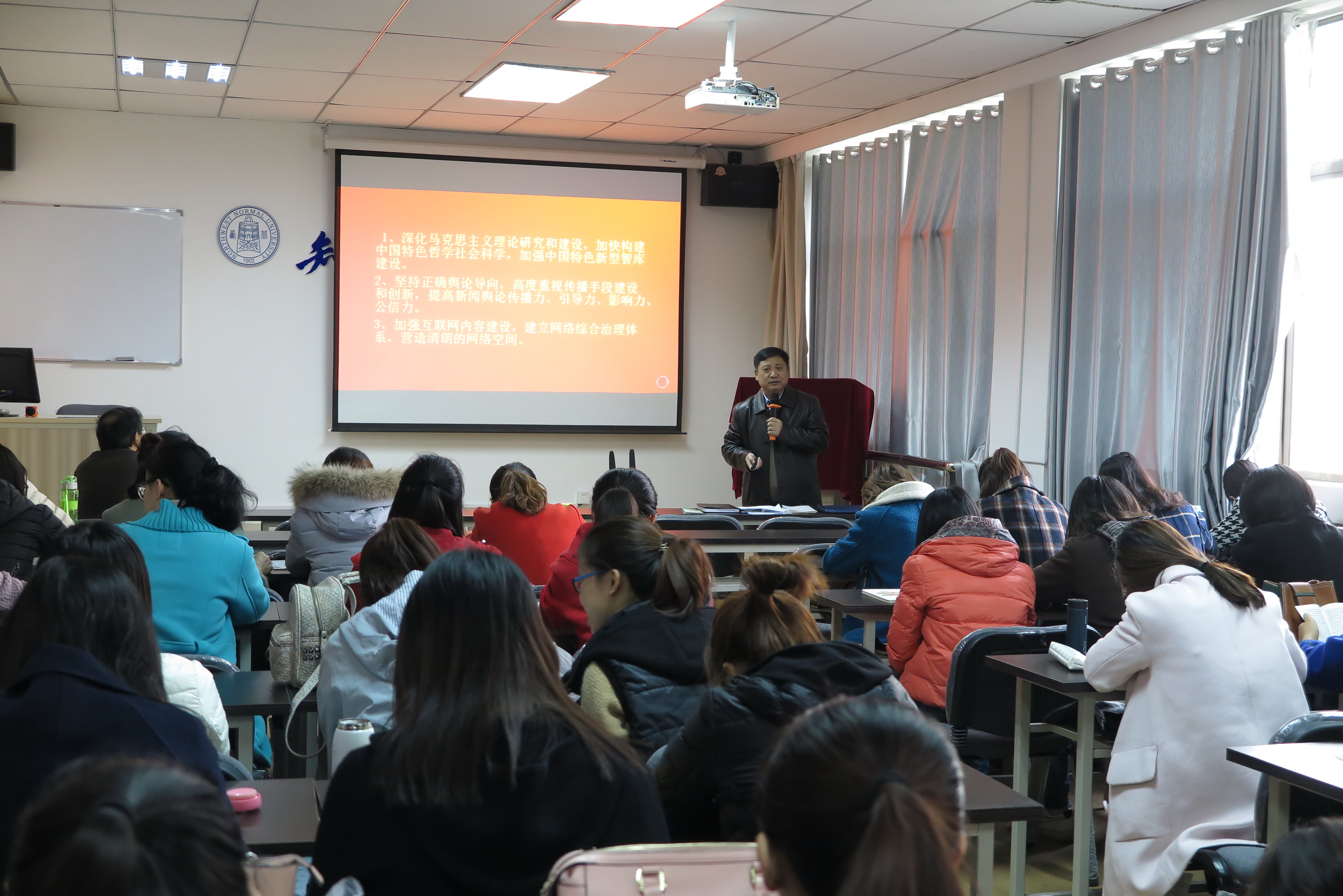 柴繁隆同志宣讲到:十九大报告讲的推动社会主义文化繁荣兴盛,也是我们学院广大师生的光荣使命,或者说历史使命。报告中讲的五个方面的关系,是辩证的逻辑关系。牢牢掌握意识形态工作领导权,这是中国共产党执政的必然要求,决定文化前进的方向和发展道路,必须推进马克思主义中国化时代化大众化,建设具有强大凝聚力和引领力的社会主义意识形态,使全体人民在理想信念、价值理念、道德观念上紧紧团结在一起,加强理论武装,推动新时代中国特色社会主义思想深入人心。