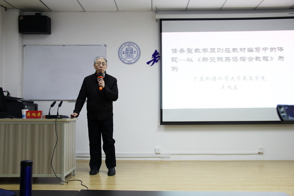 报告会上,吴旭东教授从四个方面深入浅出的分析了任务型教学原则在教材编写中的具体体现。第一,吴旭东教授就自己的理解具体的阐释了任务型教学原则的内容,其中包括外语学习目标对教学的启示、任务型教学的特点以及任务型教学课堂与传统外语课堂之间的差异。第二,吴旭东教授讲解了自己编写教材的理论模式。首先他谈到了在教材编写过程中遇到的难题,并且在教材编写过程中模式的建立,由此他提出了五个任务设计问题并做出相应的解答。第三,吴旭东教授说到了使用这部教材的操作要点,即说服员工认同教材的编写理念,并且教师要根据自己员工的情况对教授内容作相应的调整。最后,吴旭东教授为大家展示了一个单元的任务设计,通过具体的例子,深刻的说明了任务型教学的作用。