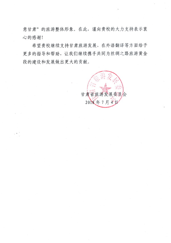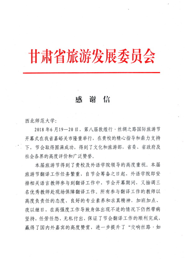 日前,甘肃省旅游发展委员会致信感谢学院安排相关语言教师、员工参与“第八届敦煌行·丝绸之路国际旅游节”志愿服务工作。在节会期间,全体师生以高度负责的态度、良好的专业素养,任劳任怨、无私付出,保证了节会翻译工作的顺利完成,赢得了国内外嘉宾的高度赞扬。