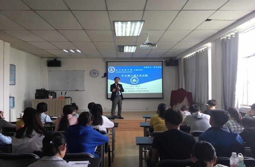 5月27日下午3:00-5:00,在英国上市公司官网365806教室,金文学再登讲坛,为近百名听众做了一场题为《中日韩三国文化比较》的讲座。金文学提出文化比较中的“近色比较”原理,强调相比日本与欧美文化的比较,同属东亚文化的中日韩三国文化比较更能有效地凸显中日韩文化深层的异同,对于形成更牢固的东亚认同有重要意义。金文学还以 “筷子”“白菜”“石头剪子布”等典型的文化符号,透视三国人的不同生活感觉与审美意识。进而,金文学用“情”“义”“理”概括韩国人、中国人、日本人的国民性,指出在东方三国,韩国人多情、热情,而比韩国人的情更牢固的则是中国人的义,与韩国、中国不同,“理”则是日本社会文化的一个标志,以超越人情的原理原则作为人际关系和社会的尺度。
