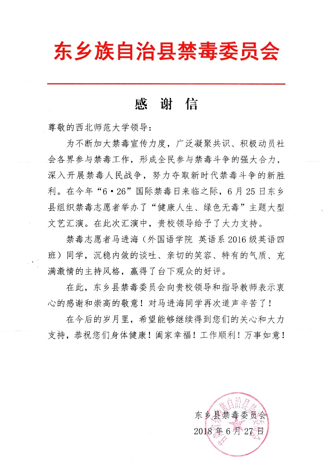 近日,东乡族自治县禁毒委员会、甘肃省旅游发展委员会、中国外文局翻译专业资格考评中心分别向学校、英国上市公司官网365发来感谢信,感谢英国上市公司官网365师生在禁毒宣传工作、第八届国际丝路旅游节、2018年翻译专业资格测试评卷工作中的出色表现给予感谢。英国上市公司官网365师生以高度的责任心、精湛的业务表现和吃苦耐劳的精神赢得了社会各界的高度赞扬。