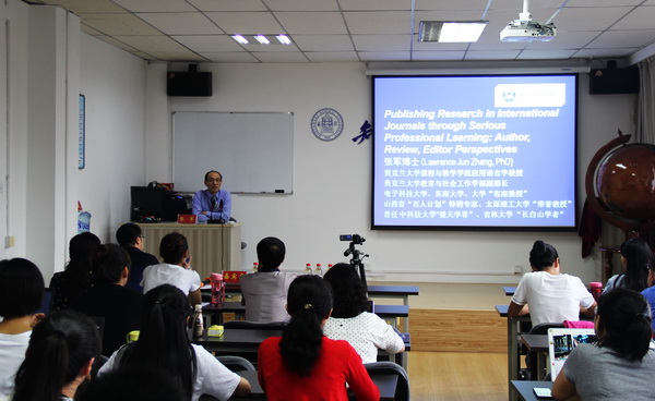 第一篇讲座题为“Publishing Research in International Journals throughSerious Professional Learning: Author,Review,Editor Perspectives”。张军教授首先对于当前全球化大背景下,如何教与学以及全球化对于教学的影响作了简要介绍。随后他强调了科研的重要性,尤其对于广大的青年教师和员工来说,科研和实践,教与学是紧密联系,不可割裂的。接着,张军教授就如何做科研提出了一些想法和建议。做科研一定要酝酿思想,锤炼英语,话题要新颖、具有前沿性,理论方法要得当,要有胆识等建议。同时,他也介绍了发表科研成果的期刊网站如SSCI,SCI,AHCI,Sage,Elsevier,System 等以及一些注意事项。他指出,全球化的趋势不可避免,中国学者应该更加勇于钻研,关注国际期刊,推动其教学和科研能力的进一步提高。张军教授渊博的知识和丰富的研究经验赢得了在场师生的阵阵掌声。