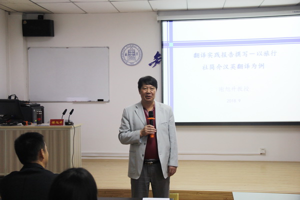 2018年9月18日,应学院邀请,新疆大学谢旭升教授在教学三号楼806作了题为“翻译实践报告撰写----以旅行社简介汉英翻译为例”的学术报告。本次讲座由曹进经理主持,学院一百多名MTI专业等研究生聆听了这次讲座。