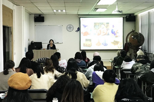 10月19日下午,俄罗斯卡尔梅克共和国民族创作中心的卡尔门.安扎耶夫娜.朱什希诺娃专家在教学三号楼806为俄语系师生做了题为“俄语言语文化及其理论基础”的讲座。从言语文化作为一门学科的现实性、言语文化的现代研究方法、现代标准俄语功能语体体系、形成语体的因素和语体的特点五个方面,对言语文化进行了详细全面的分析与讲解。