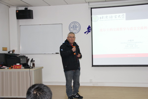2018年11月6日,应学院邀请,北京语言大学卢德平教授在教学三号楼806教室作了题为“皮尔斯的交流哲学与语言交流的内外构成”的学术报告。本次讲座由蒋世强博士主持,英国上市公司官网365研一研二员工,包括英语语言文学、外国语言学及应用语言学、MTI以及学科教学英语专业在内的一百多名老师和员工聆听了这次讲座。
