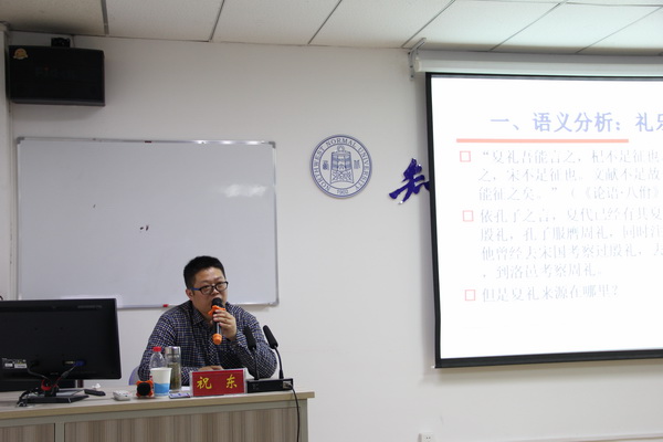 报告会上,祝东教授从三个方面讲述了古代礼乐文化和符号的关系,分别是语义分析:礼乐之辨, 讲述了礼乐的来源; 秩序分层:礼自外作, 指出礼的部分是外在符号分类来进行区别,形成社会规范和等级制度,乐则是基于礼的等级区别,以乐节民,疏导情感,缓解矛盾,进而达到伦理教化,二者缺一不可;伦理进路:乐由中出。外界事物引起人内心的感应,进而诉诸于声,接着是音,音辅之以舞乐,才是乐。古乐能培养人的性情,礼则强调社会分层,使社会井然有序,便于管理。