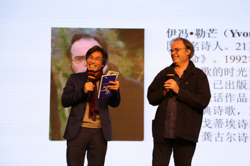 勒芒先生以一首法译诗歌为引,表达了他本人对中国诗歌尤其是李白、杜甫诗歌的热爱,介绍了自己在法国诗歌创作过程中的一些趣事并提出“生命的理由是为了诗歌”。树才先生通过他本人的高考以及学习法语的经历告诉大家,语言才是诗歌真正要去的地方。同时,他指出,学习语言离不开翻译的练习,同学们可以通过翻译诗歌及一些文学经典来提升自我。高尚先生通过介绍圣琼·佩斯、克洛岱尔、谢格兰等著名法国诗人,阐述了中国诗歌与法国诗歌的交互影响作用,他提出,诗歌应在自己的语言中涅槃,在其它语言中再生。