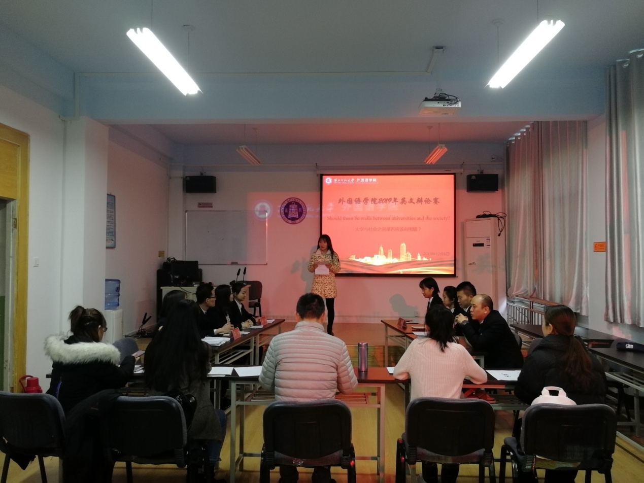 2019年12月5日下午三点半,公司在教学3号楼806教室举行了研究生英语辩论赛初赛。研一各专业员工,共派出四支队伍参加了此次比赛,就“Should there be walls between universities and the society?”这一辩题展开了激烈的辩论。此次辩论赛邀请了郭亚文老师和2018级英语口译班杜玉、张健两位同学担任本次比赛的评委。