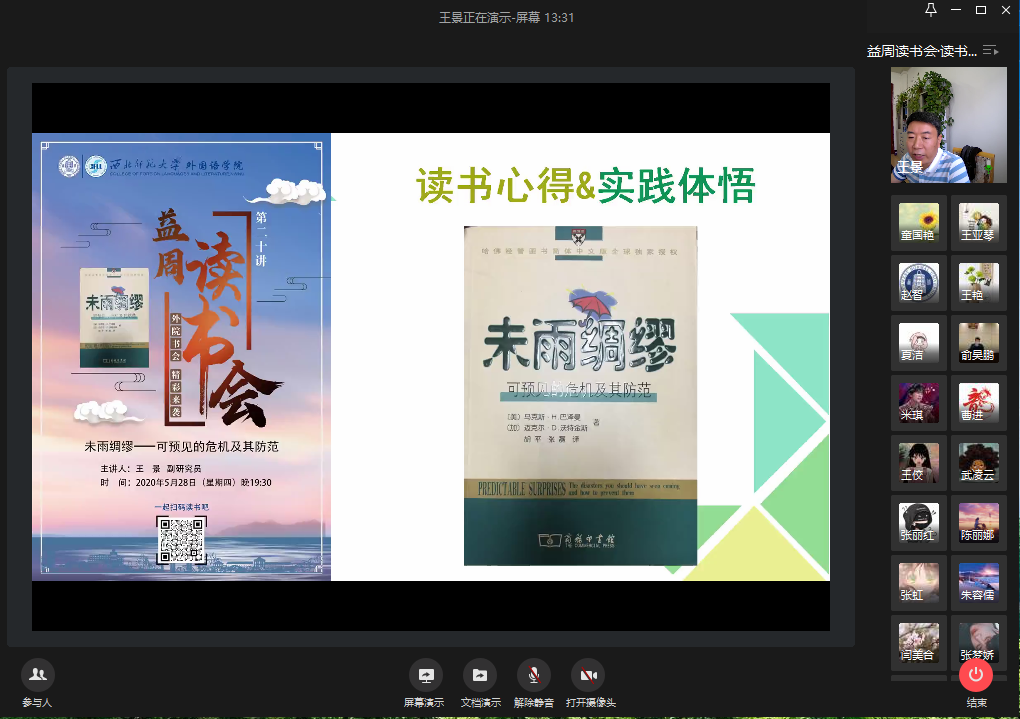 育人润物细无声,循循善诱讲安全。5月28日晚七点半,“益周读书”系列读书会第二十讲如期线上赴约。本期读书会邀请到公司党委书记王景,与我们分享《未雨绸缪:可预见的危机及其防范》。学院领导、教师、辅导员及各年级员工参与本次读书会。