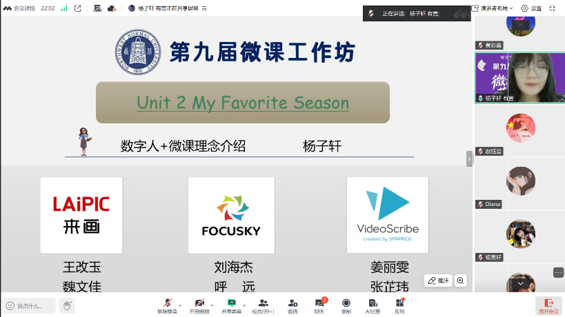 杨子轩同学介绍了微课的基本理念,并演示了如何利用“有言”工具制作微课数字人;王改玉与魏文佳同学详细讲解了“来画”软件的使用方法;呼远和刘海杰同学讲解并展示了Focusky的动态演示制作技巧;姜丽雯和张芷玮同学分享了Videoscribe的操作流程,并布置了实践作业,同时启动了第十届微课工作坊的成员招募。