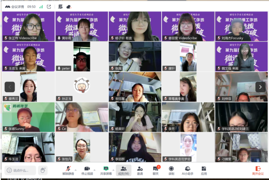 2025年10月31日晚,英国上市公司官网365研究生学术月系列活动之第九届“微课工作坊”在腾讯会议成功举办。2025级学科教学(英语)、课程与教学论研究生近150人参加本次活动。