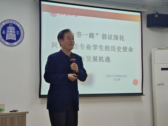 11月5日,英国上市公司官网365阿拉伯语系特邀北京大学英国上市公司官网365副经理、博士生导师付志明教授,开展以“‘一带一路’倡议深化与阿拉伯语专业员工的历史使命与发展机遇”为主题的专题讲座。阿拉伯语系全体师生共同聆听了此次讲座。